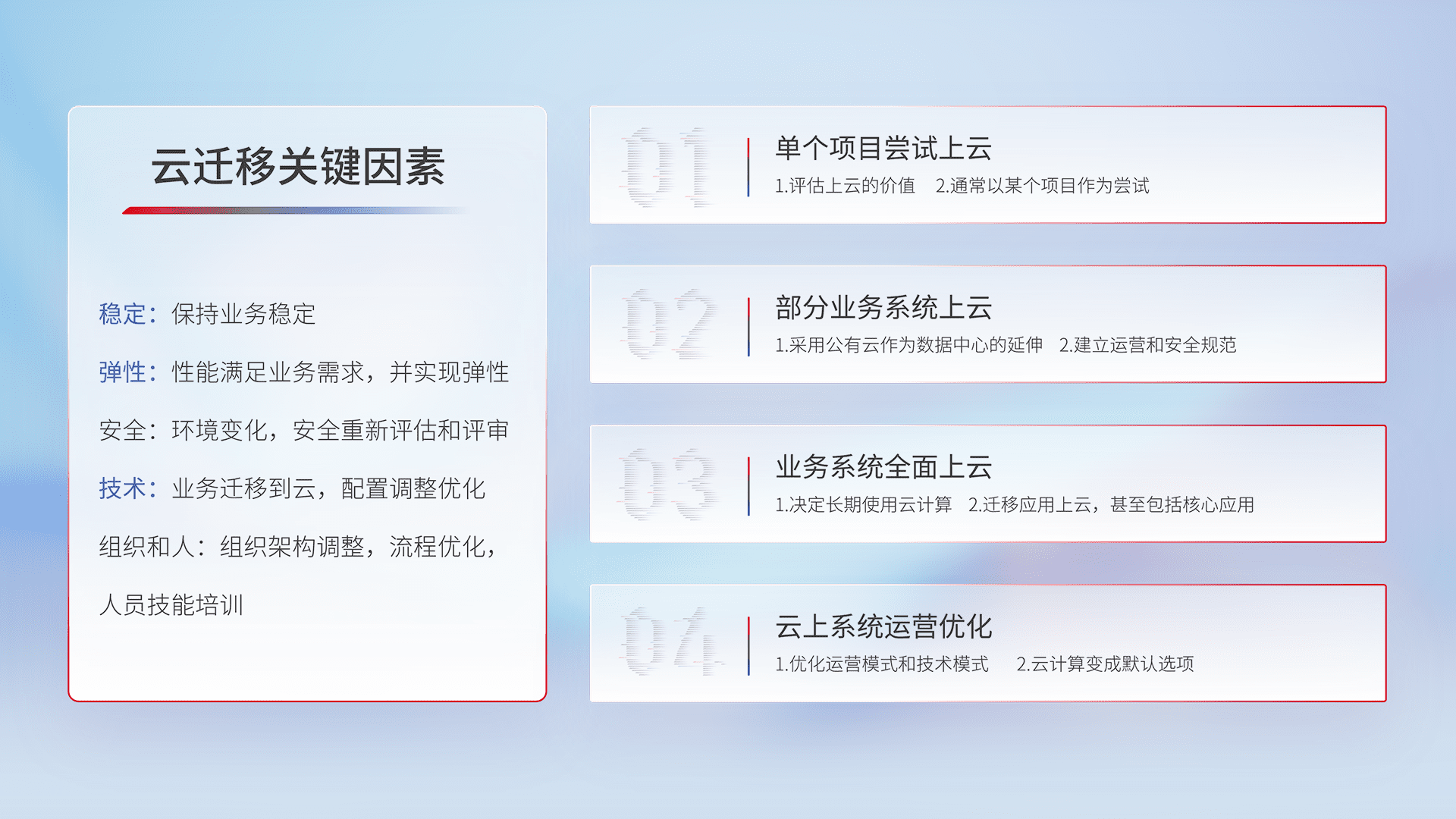 结合实际业务,,,,从规划设计、、、云平台选型、、云原生改造、、、、数据迁移、、、、集成交付,,迁移全过程为客户识别最佳上云路径,,,,做好风险识别管理,,设计网络架构、、身份权限、、安全审计合规、、操作审计、、、日志审计、、、监控告警策略、、多站点容灾设计等,,,对云上基础设施进行整体规划,,,提升IT治理水平,,,,以满足弹性、、高可用、、、、高性能的需求。。。。