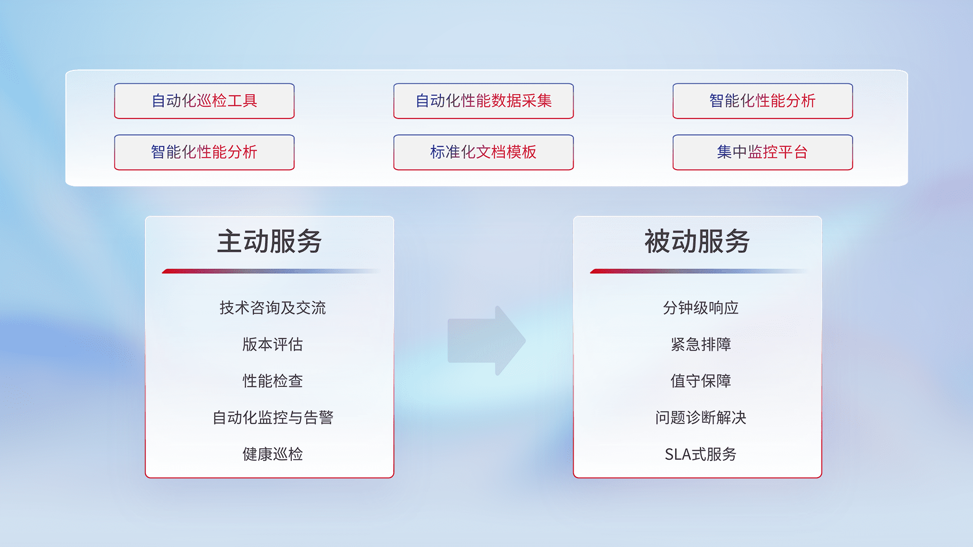 智能化工具和标准化文档,,,保障服务质量,,,,提供主动服务(包含技术咨询、、、版本评估、、性能检查、、、自动化监控与告警、、、健康巡检)和被动服务包含(分钟级响应、、、紧急排障、、值守保障、、问题诊断解决、、、、SLA服务)。。