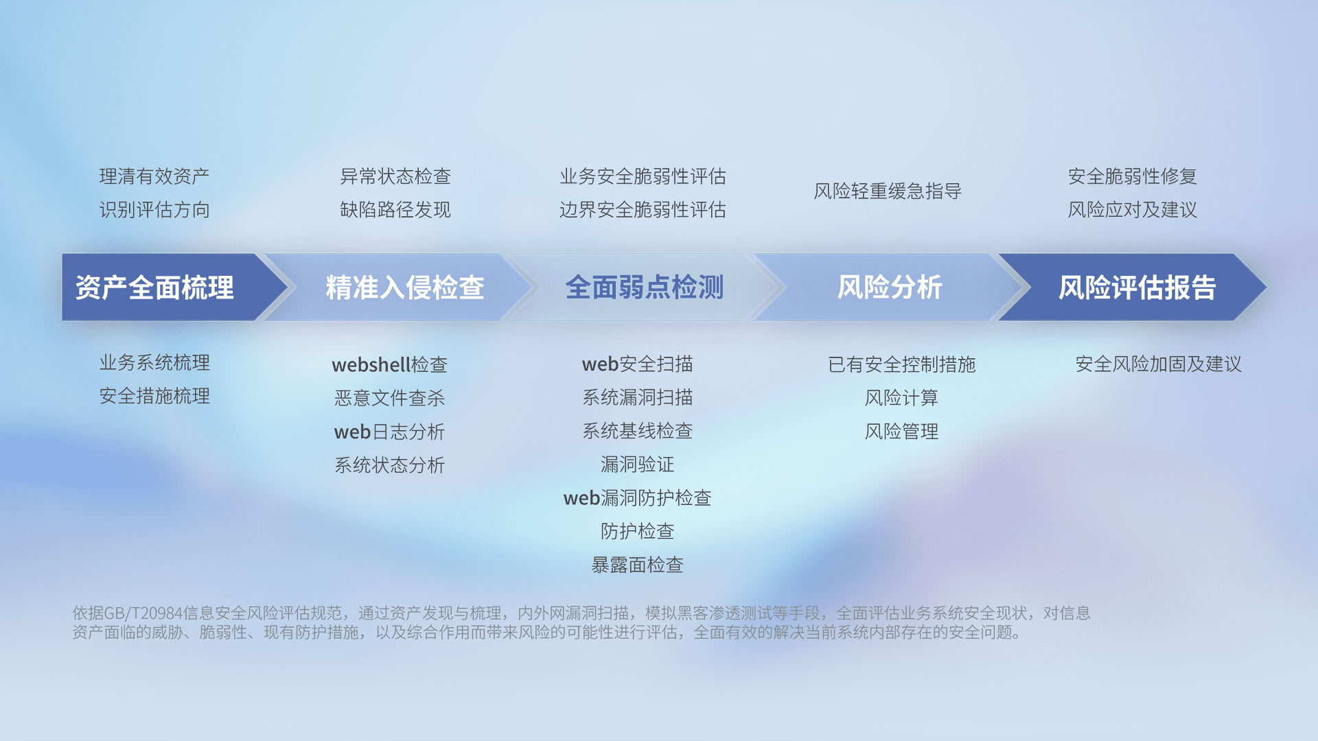 针对客户行业特性,,,以专业的安全服务+多厂商联合解决方案提供专属的一站式安全管理服务,,,,帮助客户全面感知网络空间威胁,,,,基于识别、、检测、、、分析、、、、防护、、、监测、、、响应的服务理论模型,,,,从方案咨询、、、、集成交付、、评估验证、、、优化加固、、、、运维运营,,,致力于为客户提供完整的闭环管理式安全服务。。。以实战经验为客户打造高抵御风险的安全体系,,,,帮助客户发现威胁、、、、对抗威胁、、、处置威胁,,不断积累安全对抗能力,,,,持续保障数字化安全。。
